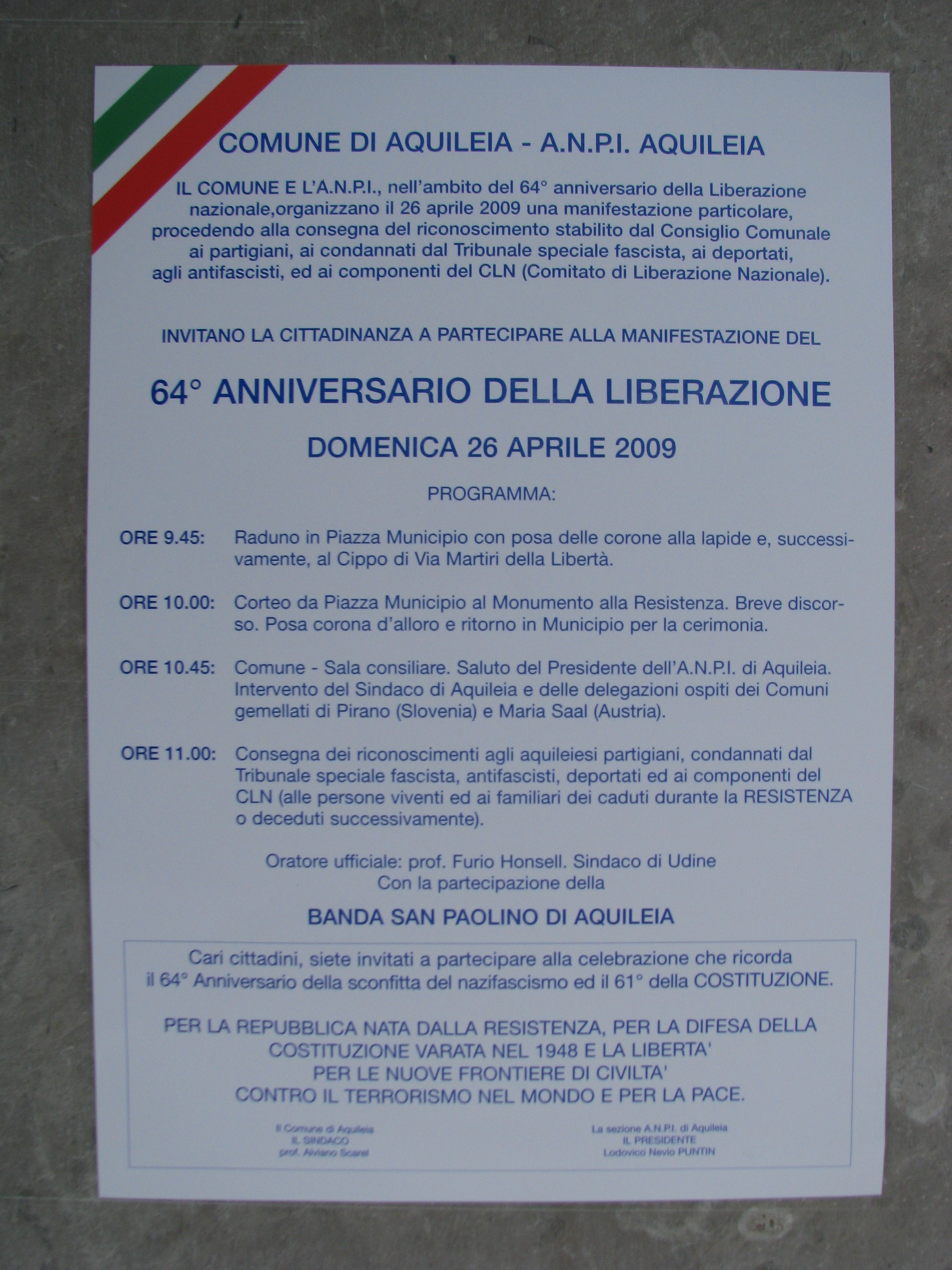hanno ritenuto di commemorare pubblicamente il contributo dato da tanti cittadini aquileiesi alla lotta di resistenza, conferendo un simbolico riconoscimento a quanti tra loro sono ancora in vita o, alla memoria, a coloro che non sono più.