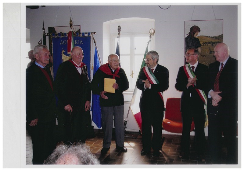 che da testimonianza del valoroso comportamento di “Arco” in numerose e delicate circostanze essendo stato membro del suo distaccamento. Gino Furlan, dopo la liberazione nazionale, è stato agricoltore, amministratore comunale, dirigente e socio di cooperative del settore agricolo. Contrario da sempre a parlare di se e soprattutto dei fatti riguardanti la RESISTENZA, negli ultimi anni ha proposto di istituire un riconoscimento del Comune e dell’ANPI di Aquileia agli antifascisti e partigiani aquileiesi. La cerimonia si è svolta nell’aprile 2009 in Comune e la foto sottostante si riferisce a quell’evento. Gino Furlan “Arco” è il secondo da sinistra, tra Bruno Violin e Gastone Andrian (alla cui destra si trovano il Sindaco di Udine Furio Honsell, il Sindaco di Aquileia Alviano Scarel e Nevio Puntin, all’epoca Presidente della Sezione ANPI di Aquileia).