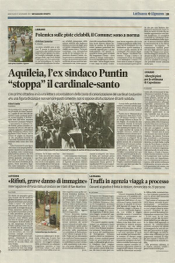 In data 15 e 16 novembre 2017 il quotidiano Messaggero Veneto pubblica due servizi, che qui riportiamo, riportanti dichiarazioni di Lodovico Nevio Puntin in merito al comportamento negativo avuto da Celso Costantini tra il 1915 e 1917 quando fu Parroco di Aquileia. Un tanto in vista del pronunciamento sulla causa di canonizzazione e beatificazione attivata dal vescovo di Concordia Pordenone mons. Pellegrini con l’editto del 3 agosto 2017. Puntin ha inviato al Postulatore e alla cancelleria della Curia vescovile di Concordia Pordenone un documento affinchè venga valutato in quanto in contrasto con la proposta di canonizzazione del cardinale Celso Costantini.