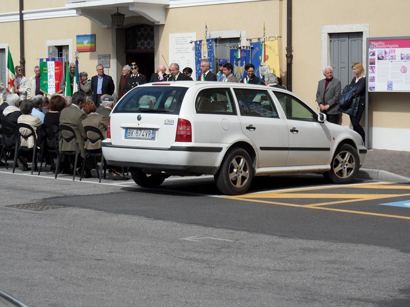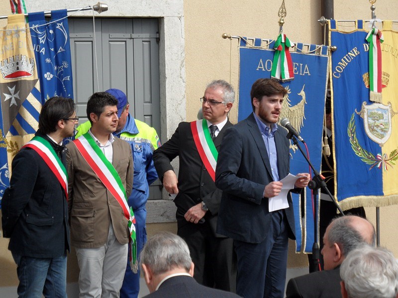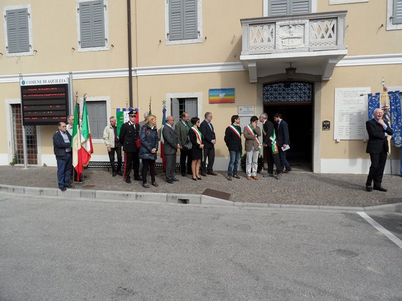 Aquileia, 14 aprile 2013. Celebrazione del 68^ anniversario della liberazione nazionale italiana dal nazismo e dal fascismo. Presenti delegazioni dei Comuni gemellati di Pirano (Slovenia – guidata dal vice sindaco Bruno Fonda) e di Maria Saal (Austria – presente il Sindaco e un Assessore), nonchè i membri dell’Associazione combattenti per i valori della lotta di liberazione di Sezana e Pirano, il Presidente della Sezione dell’ANPI di Aquileia Luca Moimas ha introdotto la manifestazione in Piazza Municipio. Subito dopo sono intervenuti l’Assessore Gabriele Spanghero, in rappresentanza del Comune di Aquileia, Bruno Fonda, Vice sindaco di Pirano e i Presidenti Bojan Pahor e Bojan Cesnik rispettivamente Presidenti delle Associazioni combattenti di Sezana e Pirano. Dopo aver reso omaggio con corone e fiori ai caduti del Monumento alla Resistenza, della lapide del Munipio e del cippo del cimitero, accompagnati dai brani eseguiti dalla Banda San Paolino, i convenuti hanno poi assistito alla proiezione del film “Carnia 1944 – un’estate di libertà” presso la sala consiliare e ascoltato gli interventi di Alessandro Puntin, capogruppo al consiglio comunale, di Giovanni Spangaro, Presidente della Sezione ANPI Udine centro e dell’istituto per la storia del movimento di liberazione friulana e di Giulio Magrini, figlio di un partigiano garibaldino morto durante la resistenza in carnia. Molto apprezzati i brani proposti dal Coro Popolare della Resistenza di Udine. Alla cerimonia aquileiese hanno pure partecipato delegazioni delle Sezioni ANPI della Bassa friulana e Sindaci e amministratori locali dei Comuni di Ruda, Terzo di Aquileia e Fiumicello.
