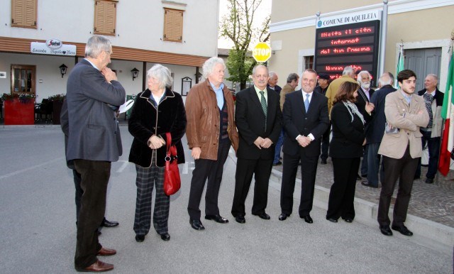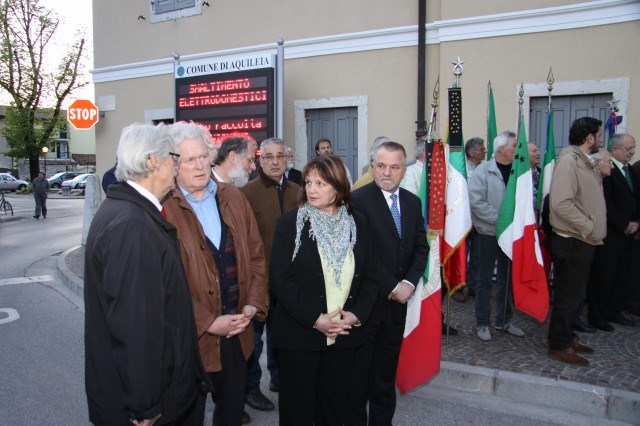Con il Sindaco di Aquileia Alviano Scarel ed il Vice Sindaco del Comune Sloveno di Pirano Bruno Fonda, città gemellata con Aquileia, erano presenti alla manifestazione svoltasi il 21 aprile 2012 Sindaci e Assessori dei Comuni di Cervignano del friuli, Villa Vicentina, Ruda, Terzo di Aquileia e Fiumicello. La cerimonia è iniziata con raduno in Piazza municipio per la posa della corona d’alloro alla lapide dei partigiani aquileiesi e corteo al monumento alla Resistenza di Via Curiel. I partecipanti sono poi proseguiti lungo via Giulia Augusta, Via Poppone e Piazza Capitolo dove nella sala romana si sono tenuti i discorsi ufficiali di: Luca Moimas, Presidente della Sezione dell’ANPI di Aquileia, Il Sindaco Alviano Scarel, il Vice Sindaco di Pirano Bruno Fonda e della Vice Presidente dell’ANPI nazionale signora Giovanna Stanka HROVATIN (Presidente dell’ANPI – V.Z.P.I. della Provincia di Trieste. La manifestazione, promossa dall’ANPI, con il patrocinio del Comune di Aquileia, ha avuto la collaborazione dello SPI CGIL, dell’AUSER e della Fondazione Valmi Puntin di Aquileia, nonchè della Banda San Paolino che ha tenuto un concerto nella sala romana.